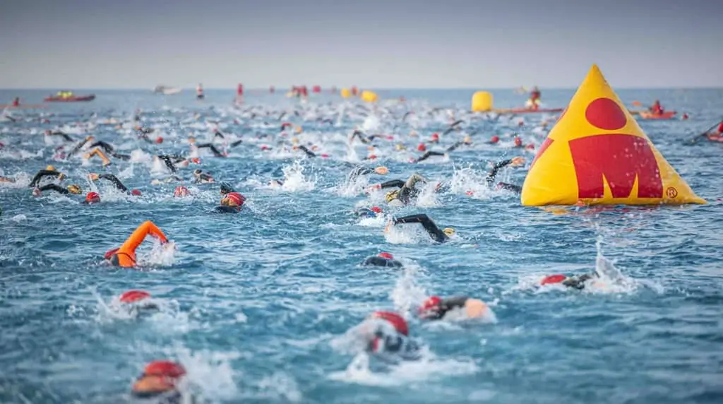 La carrera comienza con una natación de 3.8 km en el Mar Mediterráneo, partiendo desde las playas de guijarros de Niza. Los atletas deberán navegar en aguas abiertas, posiblemente lidiando con corrientes o olas, dependiendo del clima. El recorrido de natación es un solo circuito, y los participantes deben completarlo en un plazo de 2 horas y 20 minutos.